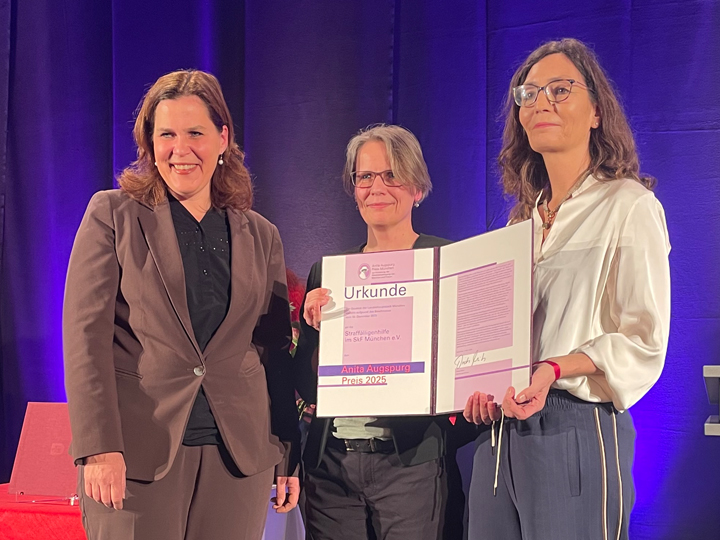 "Ein zukunftsweisendes feministisches Konzept": Vor mehreren Hundert Frauen übergibt Bürgermeisterin Verena Dietl zum Weltfrauentag die Auszeichnung. Was für ein wichtiges Signal, um die hoch stigmatisierte Zielgruppe straffällig gewordener Frauen sichtbar zu machen!